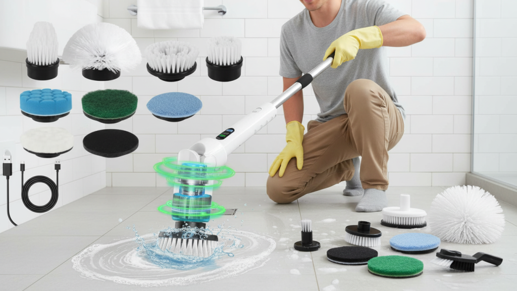 - The “8 replaceable brush heads” setup is great if you like keeping different heads for different zones (tub vs sink vs floor tile).